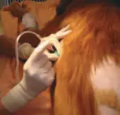 Grasp the appropriate collection set and rest part of your hand or several fingers against the animal's lateral thoracic wall. This will help stabilize your hand in the event of sudden patient movement and decrease the incidence of iatrogenic trauma to the underlying lung.