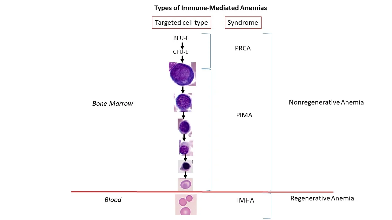 This illustration depicts the stages of orderly erythropoiesis and types of immune-mediated anemias that develop depending on the erythrocyte maturation cell-stage targeted for destruction. In cases of IMHA, mature RBCs are targeted by the immune system and destroyed.18 In cases of PRCA, BFU-E, CFU-E, or early rubriblasts are destroyed. PIMA targets stages after CFU-E/early rubriblast and before mature RBCs.16