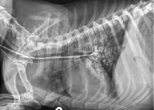 Inadvertent placement of an NG tube in the trachea and bronchus of a miniature dachshund (11 years of age). This dog had a severe pulmonary interstitial pattern secondary to infusion of 20 mL of sterile saline through the tube; it had no cough reflex during infusion (A). After injection of 3 mL of iohexol 240, positive contrast medium outlined the alveoli, particularly in the caudodorsal thorax, confirming tube misplacement (B). The following day, radiography confirmed that contrast medium and saline had been cleared from the lungs.