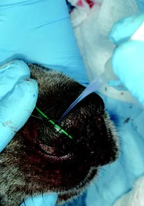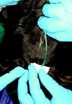 Advance the tube steadily into the nasopharynx. If there is resistance, withdraw the tube and redirect it ventrally to avoid the ethmoid turbinates. Hold the head in a normal position and allow the patient to swallow the tube.