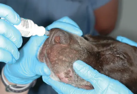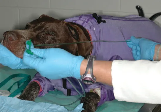 Although Elizabethan collars are recommended, many patients do not tamper with NE tubes if they are secured to the patient in a comfortable location. In this dog, the NE tube is sutured to the skin caudolateral to the planum and on the forehead.