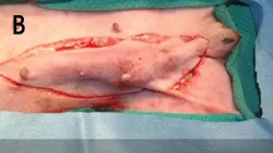 Radical mastectomy involves removal of the mammary tissue and underlying rectus fascia, muscle, or body wall (Figure 6). This procedure is recommended for mammary tumors that are fixed to the underlying body wall. The plane of resection should involve 1 full tissue layer beyond the layer to which the tumor is fixed. For example, if the tumor is fixed to the rectus fascia, a layer of muscle deep to the area of fixation should be removed. In general, removal of fascia or partial-thickness body wall does not require body wall reconstruction. If full-thickness body wall resection is required, reconstruction methods should be followed to prevent herniation of abdominal contents.