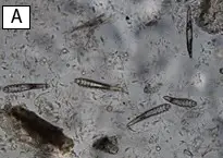 FIGURE Two species of Demodex spp mites affect dogs: Demodex canis (A) and Demodex injai (B; long-bodied mite). Two species of Demodex spp mites affect cats: Demodex cati (long-bodied mite) and Demodex gatoi (C; short- and wide-bodied mite). Magnification, 100×