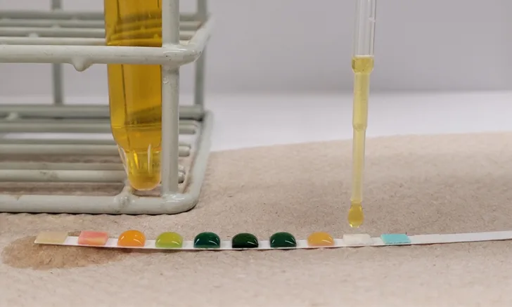 There are contradictory viewpoints on whether reagent strips should be used via the dip or drip method. The dip method consists of briefly (≈1 second) submerging the reagent strip in urine (Figure 2). The drip method consists of directly pipetting urine onto each reagent pad (Figure 3).