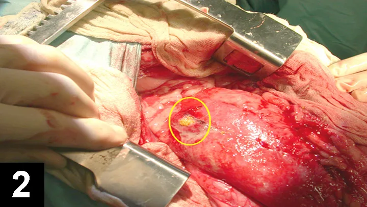 Figure 2. This dog was treated for peritonitis after successful medical management of GDV 24 hours previously. A perforation of the stomach was discovered during an exploratory laparotomy.