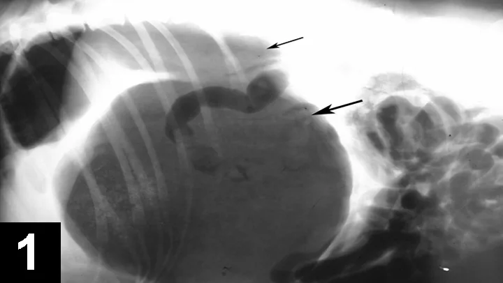 Figure 1. A right lateral recumbency abdominal radiograph demonstrates the movement of the pylorus dorsally (small arrow) and the fundus ventrally (large arrow).