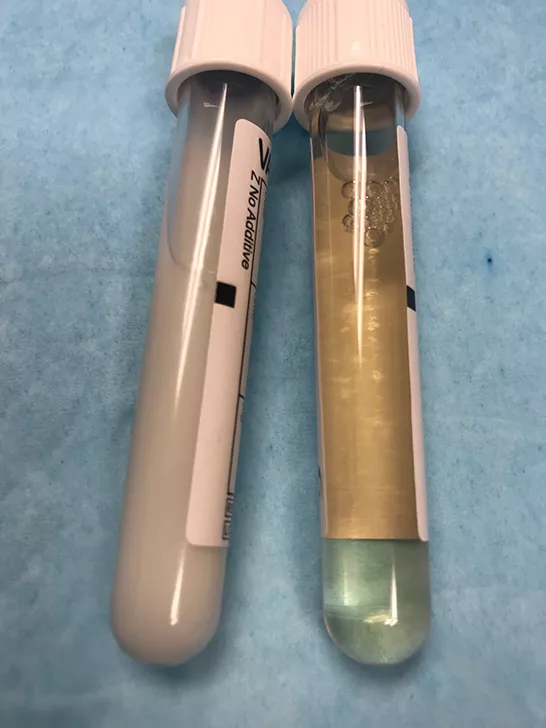 Left lateral thoracotomy revealed LLT in the caudal portion of the left cranial lung lobe, and a lung lobectomy was performed. A 20 Fr thoracostomy tube and pleural catheter were placed for postoperative recovery, monitoring, and pain control (Figure 5). Two days postoperation, the amount of pleural effusion aspirated from the thoracostomy tube was still significant in quantity (72 mL/kg/day) and off-white in color (Figure 6). The fluid was confirmed to be chylous effusion based on cytologic examination results (ie, lipid droplets, moderate numbers of mature lymphocytes, and a few macrophages) and paired serum (95 mg/dL) and effusion (819 mg/dL) triglyceride levels.