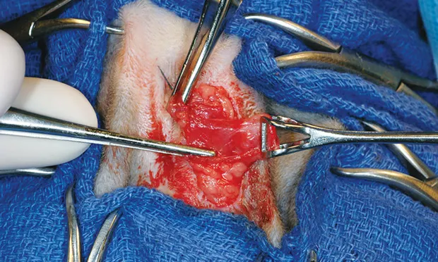 After the patient is positioned and aseptic preparation completed, make a 2-cm curvilinear incision over the anal sac, ~1–2 cm lateral to the opening. Identify the location of the anal sac by digital rectal palpation of the anal gland before placing a purse-string suture by inserting the tips of a closed hemostat through the duct into the sac during surgery.