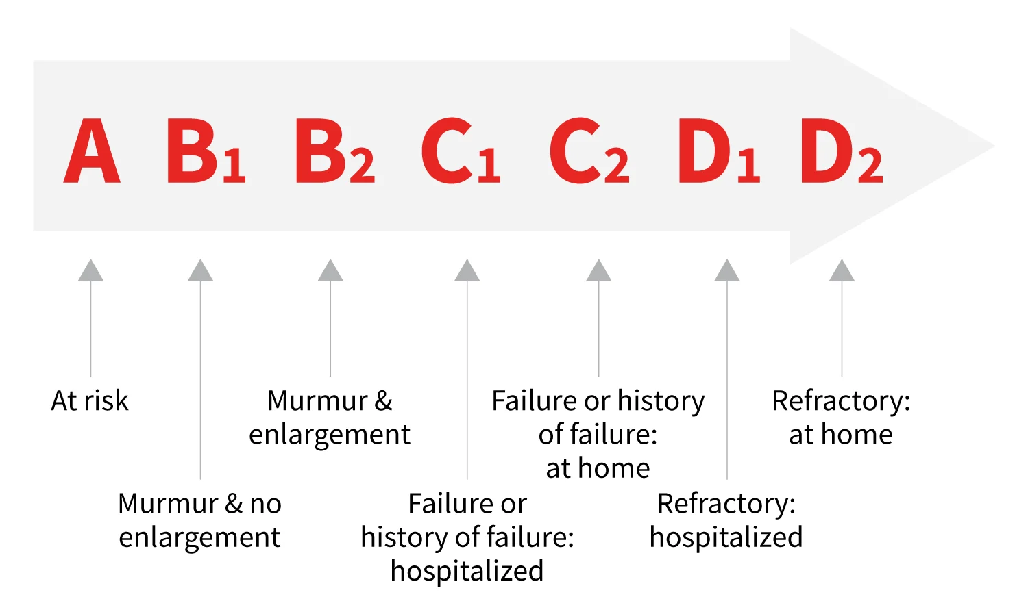 The ACVIM consensus statement offers additional information regarding staging and medical therapy for MMVD (Figure 1).3 Historical and physical examination findings such as exercise intolerance, cough, tachypnea, dyspnea, collapse, end-inspiratory crackles, tachycardia, and arrhythmia should raise concern for decompensating MMVD and/or overt heart failure.