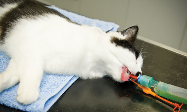 An inhaled anesthetic agent is recommended. Adjunct drugs (eg, opioid, lidocaine CRI) may be used to provide analgesia and/or decrease the inhaled anesthetic dose if warranted.