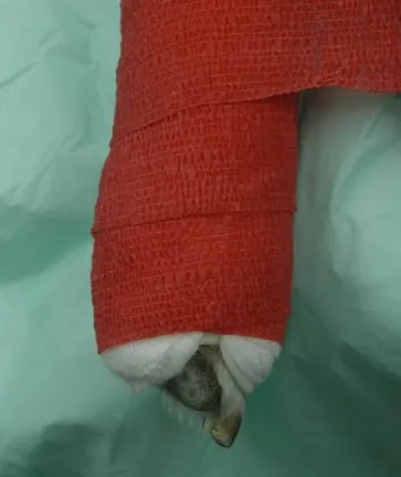 Figure 5 Distal aspect of a modified Robert Jones bandage with the pads and nails of P3 and P4 exposed to assess for swelling, cyanosis, and hypothermia