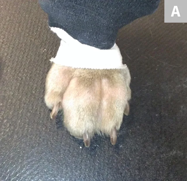 The nails and pads of digits 3 and 4 should be visible to assess for swelling and hypothermia. Initial bandage injuries will likely manifest in the first 24-48 hours of bandage application; therefore, bandages should be reassessed 24 hours after application.11 This is important, as many bandages in veterinary medicine are applied under sedation or anesthesia—particularly casts in cases that are considered at high risk for developing complications.6