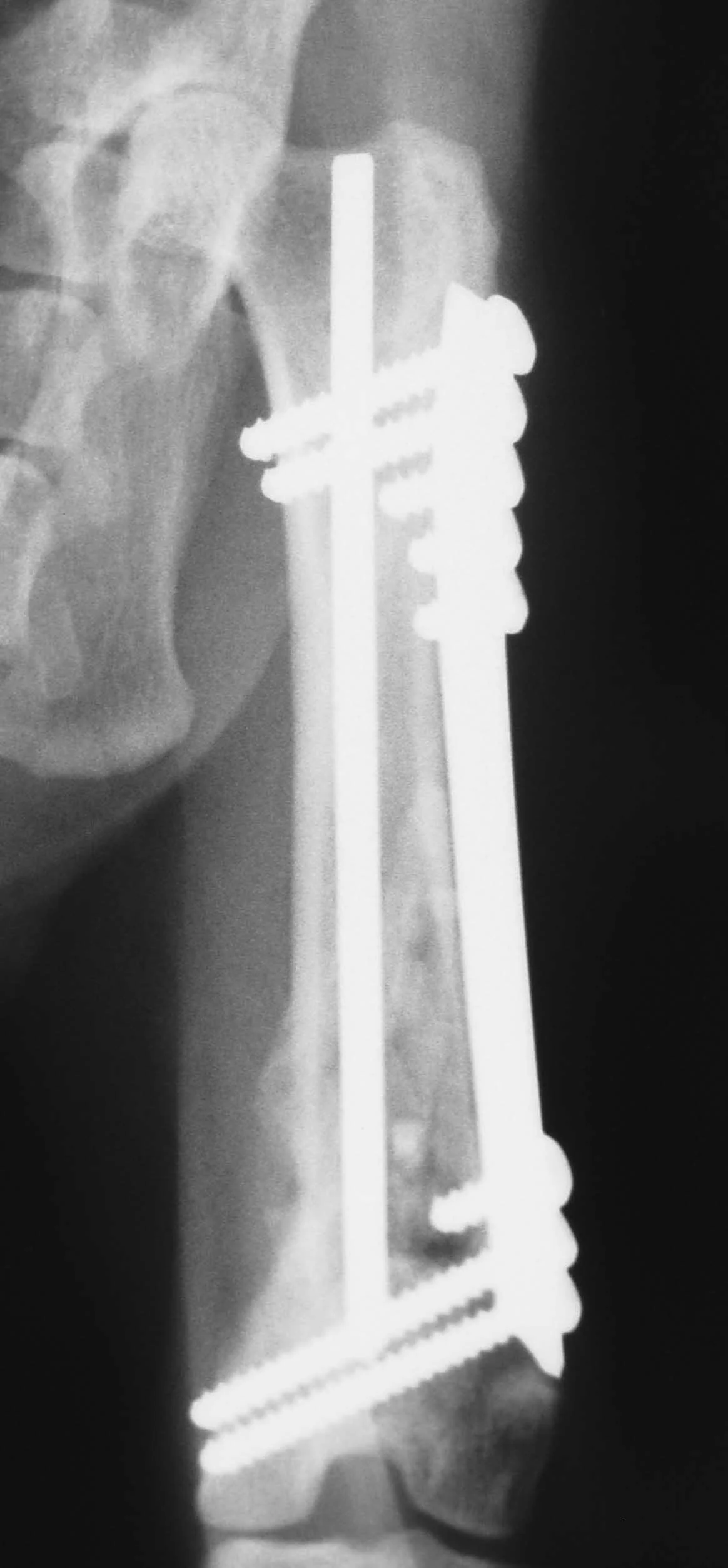 The surgeon must be careful to attain rotational alignment before placing the screws of the bone plate. Only two to three screws are needed in the proximal and distal fragment. Monocortical screws are placed if the screw cannot be directed to avoid the IM pin. Open screw holes are protected by the IM pin and early bone callus, decreasing the chance of plate breakage.