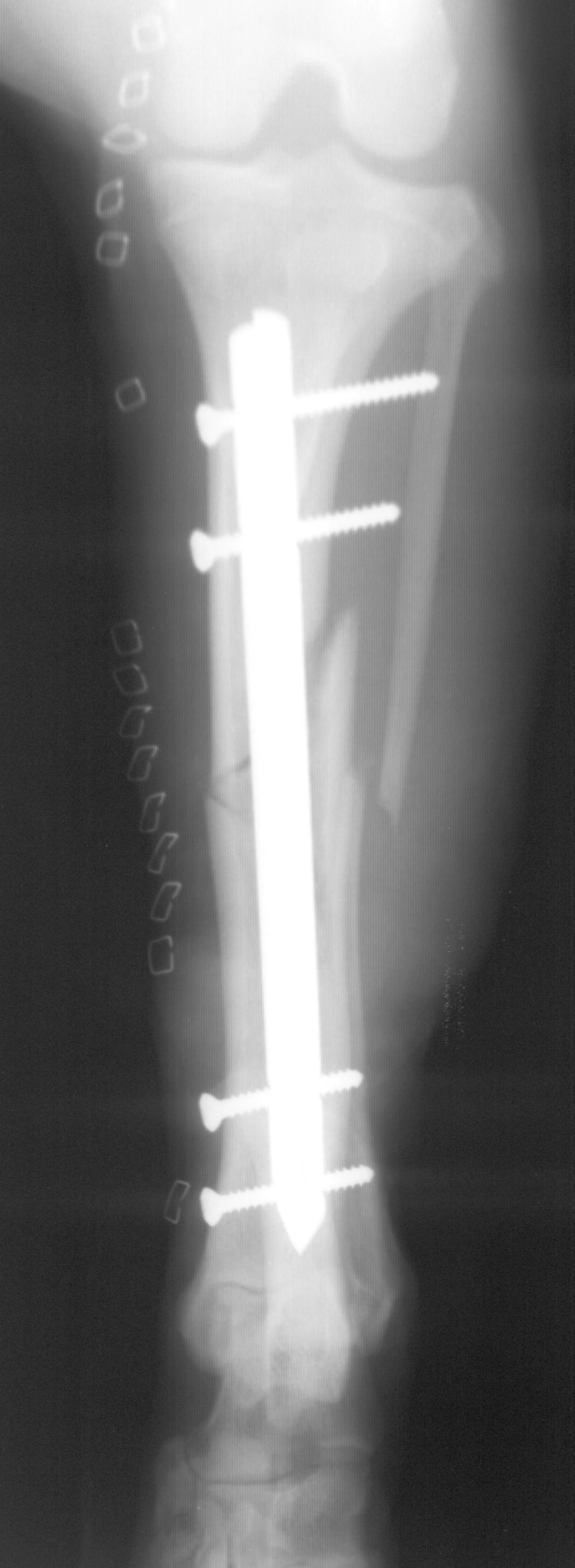 Healing of the comminuted tibial fracture shown in Figures 2A and 2B after stabilization using an interlocking nail system. This fracture reached bony union in 8 weeks.