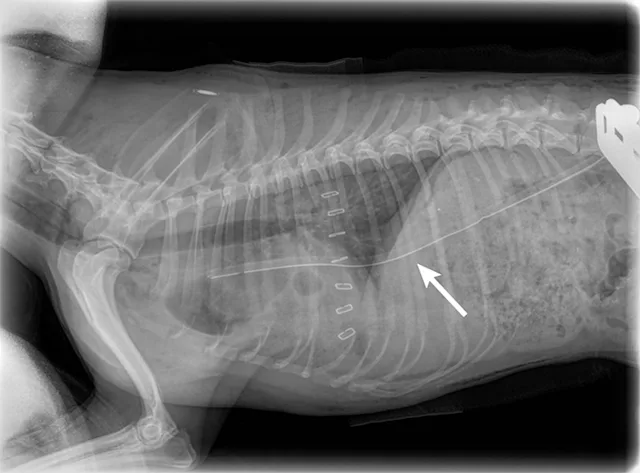 Radiography should be conducted for wounds overlying the thorax or abdomen to look for intracavitary air that may warrant exploratory surgery. Thoracic radiographs should be evaluated for fluid outside the lungs (eg, hemothorax), pneumothorax, and/or rib fractures.3 Abdominal radiographs should be assessed for pneumoperitoneum. Areas between the stomach and diaphragm and ventral to the hypaxial muscles of the spine are common locations for detection of small amounts of air. Free air in the abdomen is a direct indication that emergency surgery is needed.