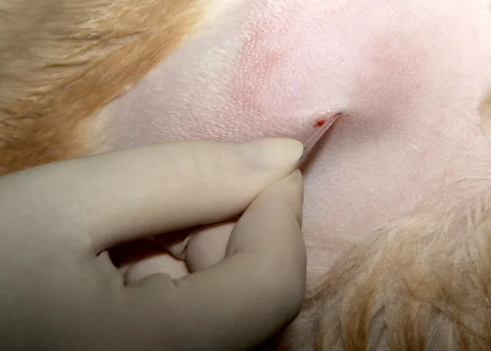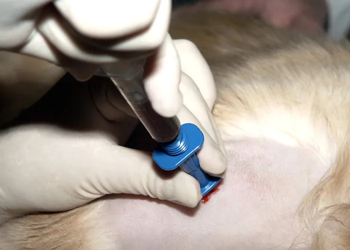 In large dogs, biopsy can be done on the third, fourth, or fifth sternebra. Biopsy of the sternum is associated with risk for inadvertent penetration of the thorax and damage to structures in the thoracic cavity. A short biopsy needle (preferably with an adjustable guard) should be used, and care should be taken to remain in the center of these bones to minimize the risk for pneumothorax, uncontrolled hemorrhage, and cardiac laceration. Biopsy samples may be taken from other sites if specific lesions are identified using diagnostic imaging.