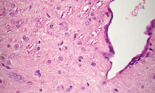 The specific lesion of CDV is eosinophilic intranuclear/intracytoplasmic inclusion bodies in glial cells, neurons, epithelial respiratory cells, and cells of the GI and urogenital tracts (Figure 1).