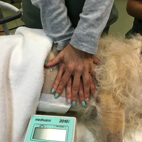 In larger animals (medium- to giant-breed dogs), it is recommended to compress the widest part of the thorax using the palms of both hands stacked one on top of the other in parallel, with the animal in left or right lateral recumbency.