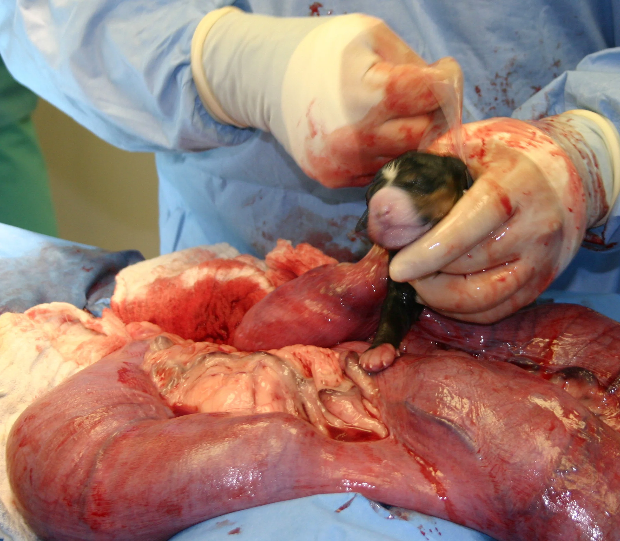 Repeat the procedure for all fetuses, making as many incisions as needed in the first and then second horn of the uterus. Puppies implanted in the body of the uterus are generally delivered using the most caudal incision.