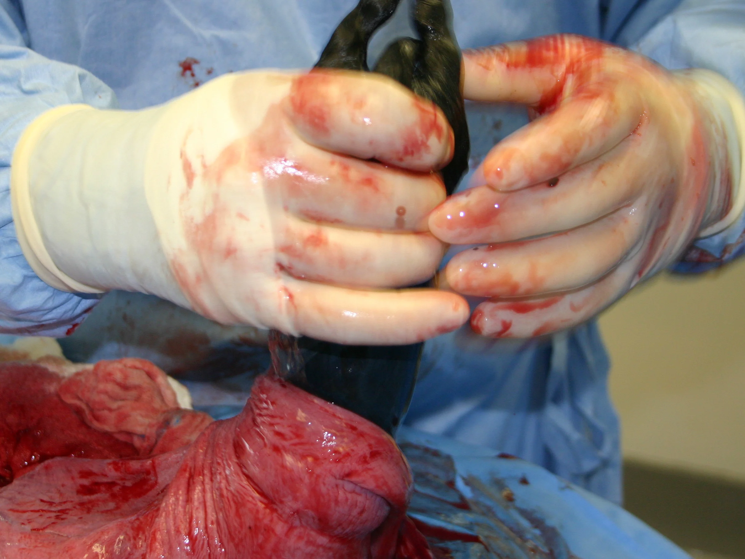 Placentas are easy to detach when the c-section is performed at the expected due date (emergency c-section for a dystocia or perfectly timed elective c-section) but may be more difficult in preterm animals. Similarly, bleeding from the maternal endometrium is not a great concern when the c-section is perfectly timed, but it can be profuse if the surgery is performed too early. For this reason, difficult-to-detach placentas are more and more often left in situ to be expelled naturally during the next few days or resorbed.