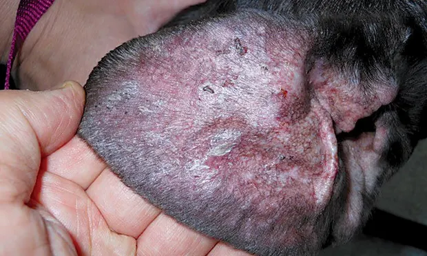Presenting concerns included persistent dermatitis, pruritus, and progressive malaise. The clients reported that the dog seemed hesitant to rise or walk, as if painful. Skin lesions at presentation consisted of generalized patchy alopecia, intense erythroderma, and fine adherent scales. Lesions were most evident on the pinnae, dorsal muzzle, dorsum of the head, and flank regions. A patchy-to-diffuse dermatitis consisting of excessive scale and crust was noted on the body. Mild lichenification with slight scaling affected glabrous regions of the chest and ventral abdomen. The patient appeared mildly lethargic and stiff. There was no joint swelling, and pain could not be elicited with joint palpation. Mild pruritus was evident (Figure 1).