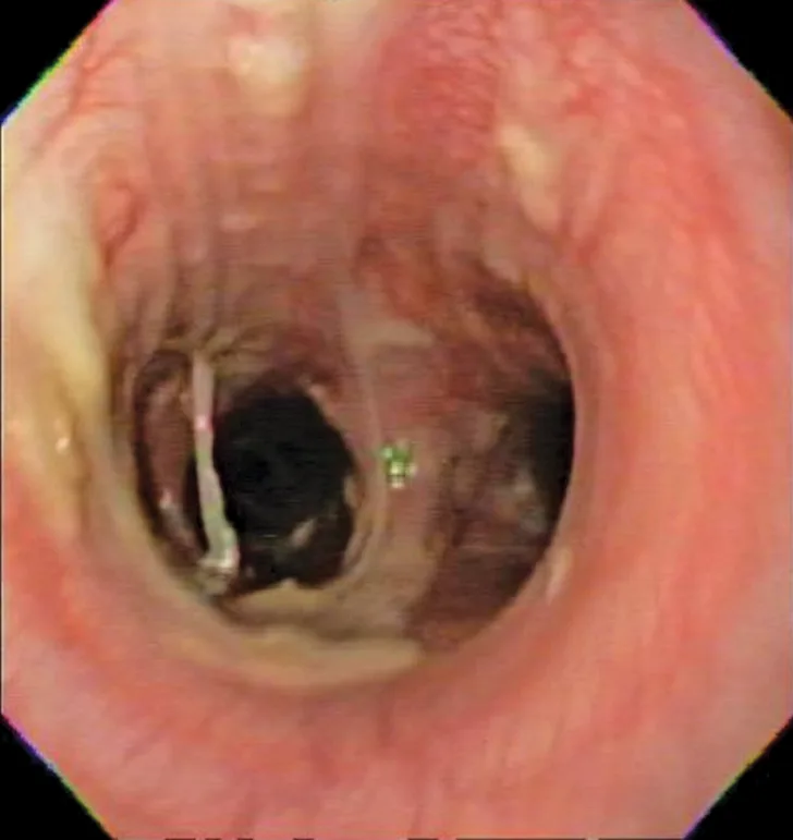 Bronchoscopy results demonstrating mucosal irregularity, hyperemia, and characteristic greenish-yellow airway exudate