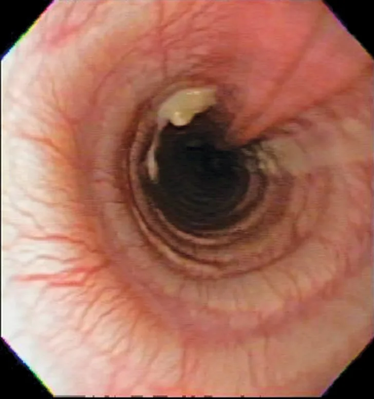 Bronchoscopic visualization revealed a moderate amount of thick, adherent, greenish-yellow mucus in the trachea and secondary and tertiary bronchi; mucosa was moderately irregular and erythematous (Figure 2). There was no evidence of airway collapse. Samples were collected via bronchoalveolar lavage for cytology, aerobic culture, and Mycoplasma spp culture.