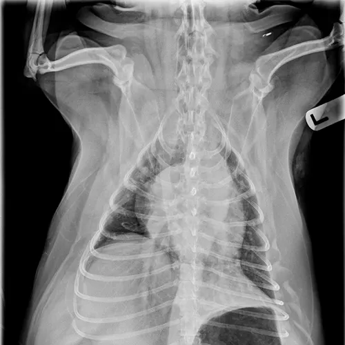 Thorough clinical history and physical examination are necessary to identify potential underlying causes. Careful auscultation of the upper airways is important. Radiographs often reveal bilateral, caudodorsal interstitial, and/or alveolar disease. Radiographic progression can occur for as long as 48 hours.27