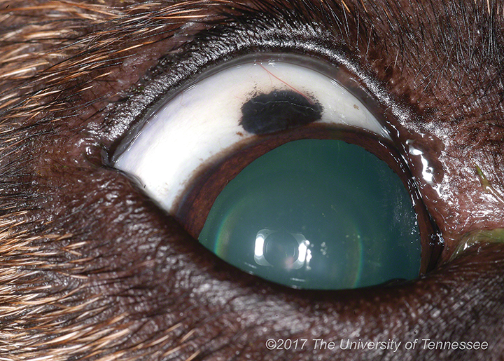 Limbal melanocytomas (Figure 8) are benign, heavily pigmented lesions that occur most commonly in German shepherd dogs and Labrador retrievers.4,5 These tumors can expand locally but do not invade the globe or metastasize. They are treated via surgical debulking with diode laser ablation.4