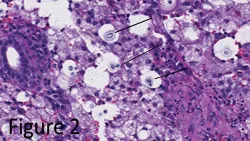Narrow-based budding yeast capsules evident (See Figure 2).