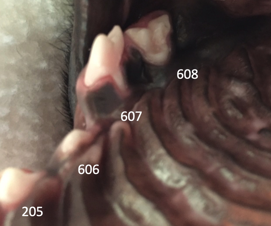 Uma was uncooperative and resistant to evaluation of the oral cavity. Examination of the buccal aspect of the right maxillary premolar teeth was unremarkable. A video of the palatal aspect of the right maxillary premolar teeth was obtained, and frame-by-frame evaluation revealed a possible slab fracture of the deciduous right maxillary third premolar tooth (ie, 507; see Suggested Reading for review of modified Triadan system numbering).