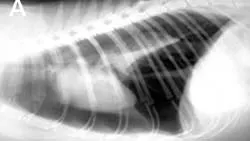 Pneumothorax is evident in this thoracic radiograph of a cat (A), as the cardiac silhouette is elevated from the sternum on the lateral projection and the lung lobes are collapsed. Close-up of the lateral view (B) shows air between the sternum and cardiac silhouette. In my experience, the lateral view is more sensitive for detecting pneumothorax because the elevation of the heart from the sternum is easily appreciated. When viewed from dorsoventral (DV) or ventrodorsal (VD) positioning, the lack of blood vessels extending out to the periphery and increased lucency of the lung fields could be overlooked.