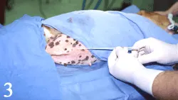 After the ventral abdomen is prepared, inject 2 ml of 2% lidocaine (without epinephrine) at the predetermined catheter site, 2 to 3 cm caudal and lateral to the umbilicus. Catheterize and drain the urinary bladder before placement of the abdominal catheter to assist in avoiding inadvertent trauma to the urinary bladder. Make a release incision in the skin.