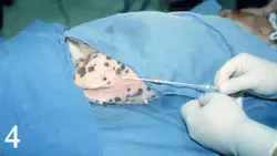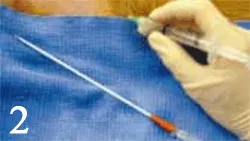 After distributing the fluid, return the patient to lateral recumbency and attach a sterile collection system or syringe to the catheter.