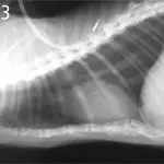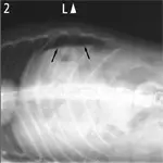 Figure 3. Thorax of a cat with intestinal adenocarcinoma(lateral view). Note the gas opacity caudal to the diaphragm (black arrows) that shows a separation of the diaphragm and liver (white arrow).