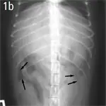 Figure 1. Crescent and triangular areas of free intraperitoneal gas (arrows) are shown that do not correspond to the tubular-shaped pattern of gas seen in the small intestine.(A) Lateral view, above. (B) Ventrodorsal view