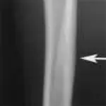 Figure 1B. The fracture is more clearly seen 4 weeks later following bone resorption and periosteal proliferation at the fracture site.