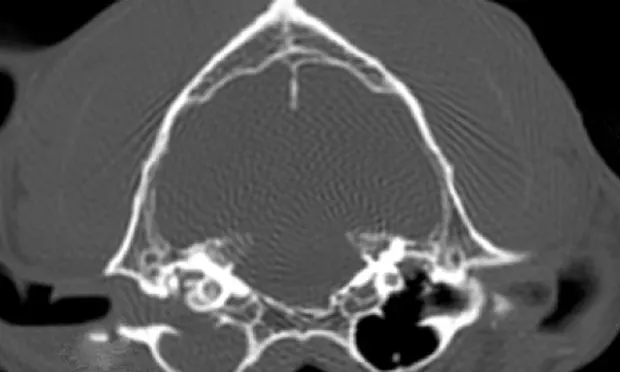 Cytology of the left ear showed too-numerous-to-count bipolar rods and degenerative neutrophils (Figure 1). A CT scan was recommended over radiographs because of its availability, the history of cutaneous lymphoma, and to rule out neoplasia of the ear canal (Figure 2). The CBC revealed a mild leukocytosis with mild neutrophilia and was consistent with a stress leukogram. Chemistry panel and urinalysis were within normal limits. Gentle deep ear flush was done repeatedly with warm saline to clear the exudate. The canal was erythematous, inflamed, and ulcerated, and the tympanic membrane was not visualized. Bacterial culture of the left middle ear exudate produced heavy growth of Pseudomonas aeruginosa. Following the deep ear flush, the left ear was reexamined with the video otoscope (Figure 3).