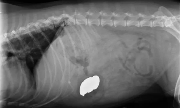 Lateral abdominal radiograph revealing metallic foreign bodies