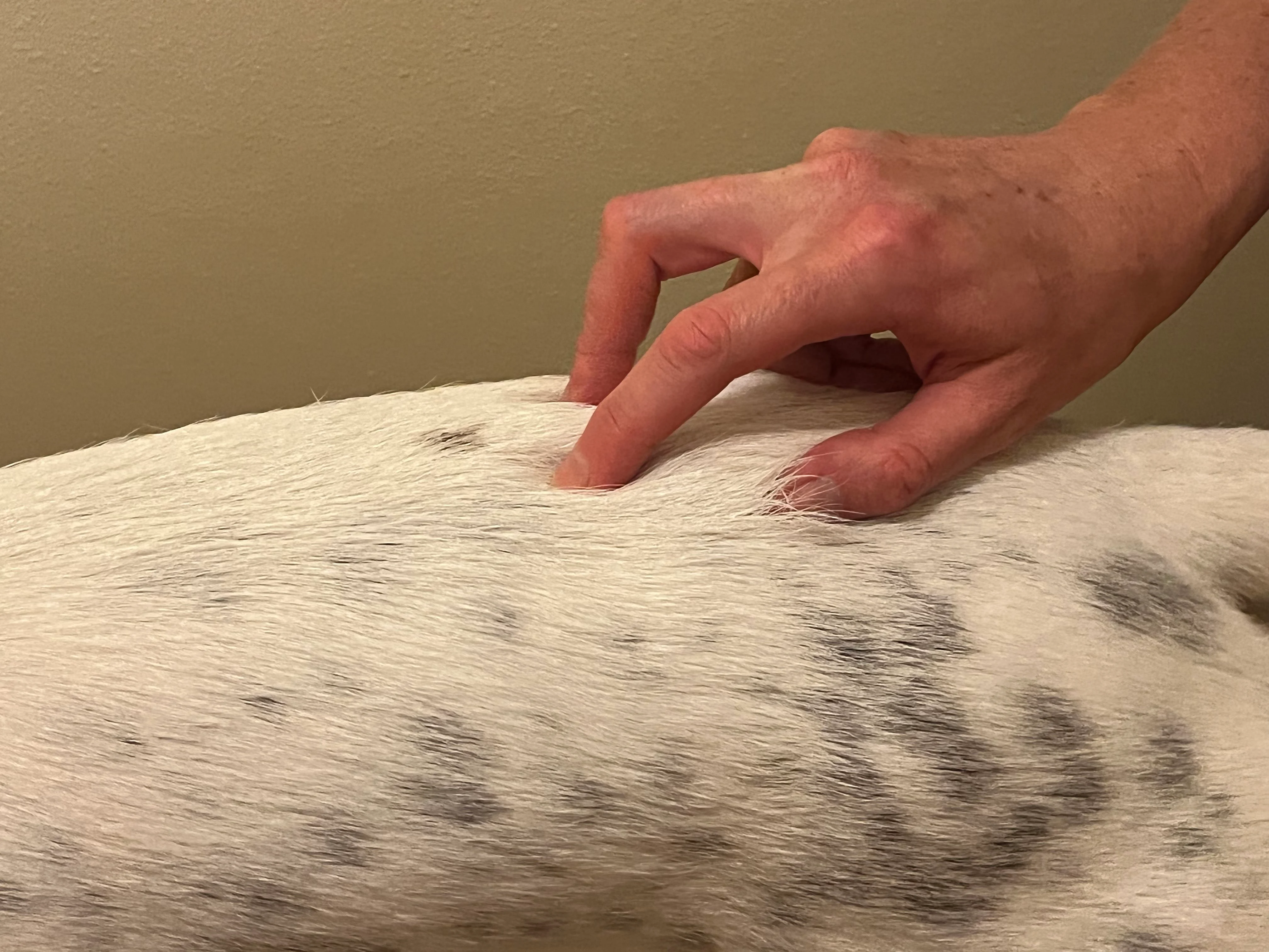 The owner reports that spinal pain appears intermittent, worsens in cold weather, and occasionally results in vocalization when Chuck’s dorsal lumbar and pelvic regions are touched. Vaccinations, heartworm/flea/tick prevention, and fecal analysis are current.