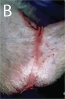 With second intention healing, the wound heals on its own but often results in a thin, pink, fragile epithelium (arrows, A). The loss of significant amounts of tissue can result in a tight, hairless epithelial scar or contracture that limits joint movement (B).