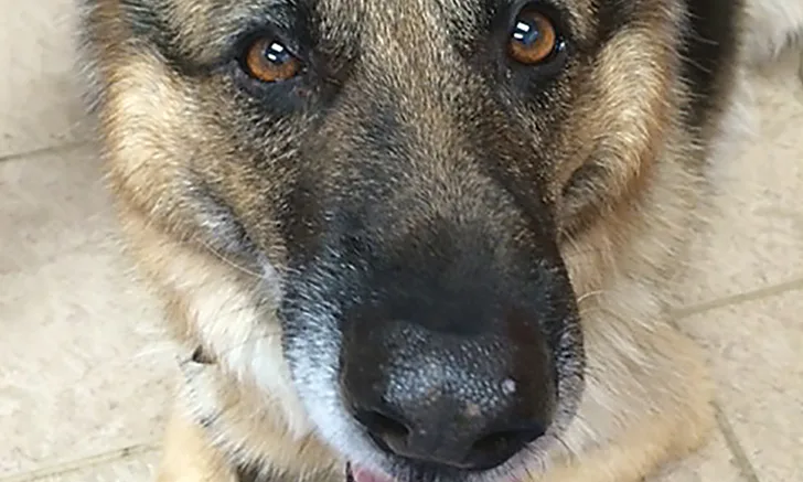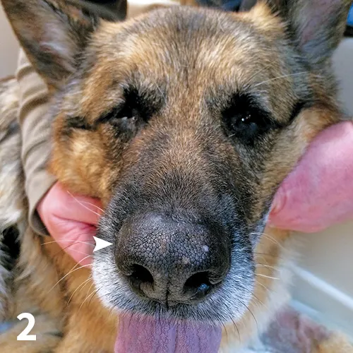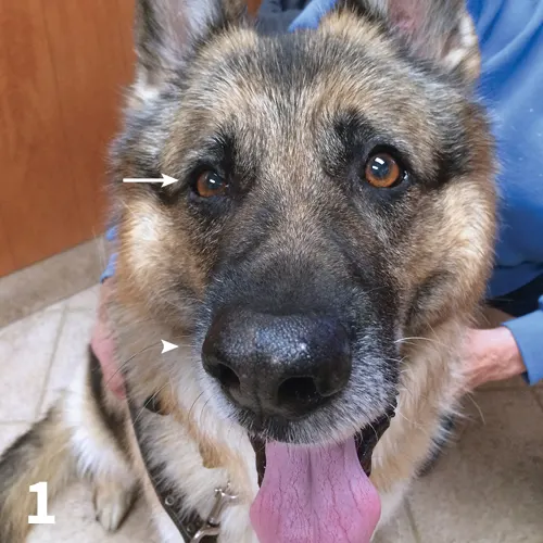 Hansel, an 8-year-old neutered male German shepherd dog, was referred for persistent squinting and an inability to blink his right eye (OD).