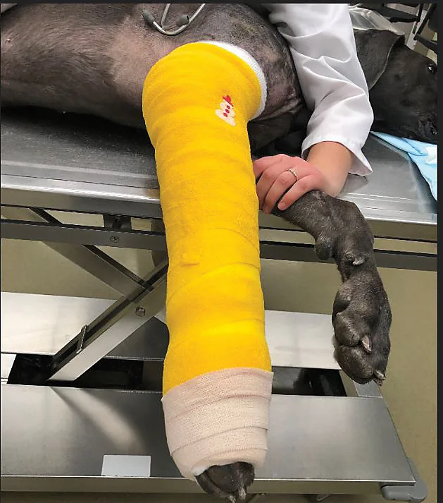 External coaptation should be performed for an additional 10 to 14 days until the incision heals (Figure 4). Bandages should be changed every 3 to 5 days to assess the wound for complications. As an alternative to external coaptation, foam insulation can be applied to protect the elbow.13 Once the surgical site heals, the owner should be advised of the necessary lifelong changes to care, including providing soft bedding, padding the elbows if erythema is observed (usually the first sign of pressure sores), and maintaining an ideal body condition.
