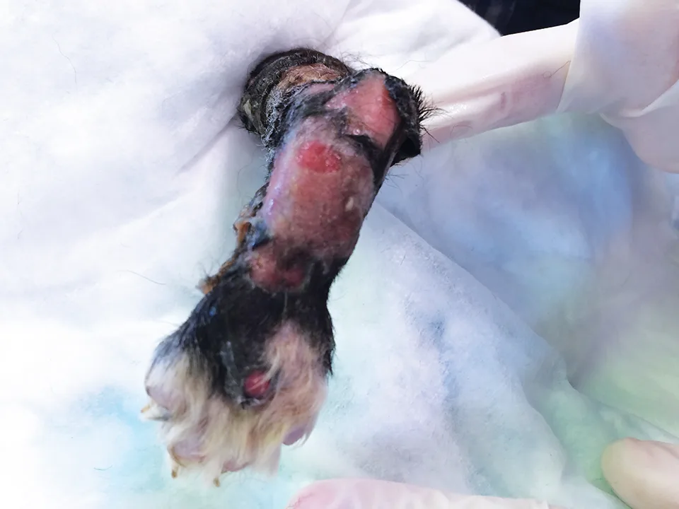 A 4-day-old neonate's skin is sloughing from the hind limb secondary to neonatal septicemia originating from the umbilicus.