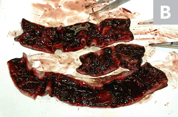 Acute lethal hookworm infection showing numerous adults and immature stages of A caninum (A) and enteritis with hemorrhage seen at necropsy (B) in a 3-month-old greyhound that received multiple treatments with fenbendazole, pyrantel pamoate, and ivermectin. Images courtesy of Michael Dryden, DVM, PhD