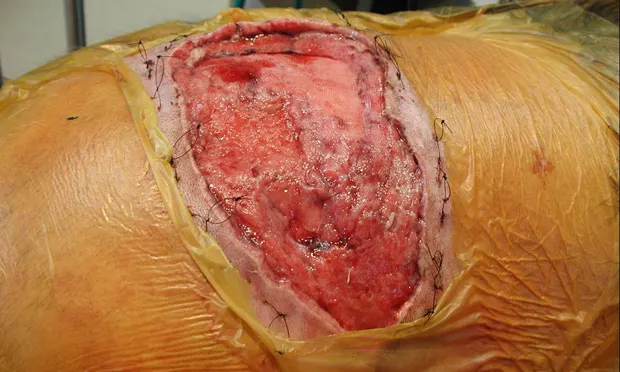 ASK YOURSELF ...How would you initially manage this wound?A. Debride necrotic skin and apply a wet-to-dry bandage around the body.