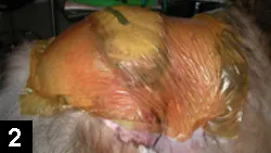 An Ioban bandage can be used over the torso to prevent dehiscence of an incision that has been sutured under moderate tension following removal of a large tumor. In such a case, following closure of the incision, a thin strip of folded gauze sponges is placed over the incision line, a 4-inch area of skin on each side of the incision is liberally sprayed with Vi-Drape, and then a layer of Ioban material is applied to relieve tension from the incision. To add strength to the bandage, 4 additional layers of Ioban are then applied on top of the first layer. The Ioban is left on for about 1 week; by this time, stress relaxation of the collagen fibers has occurred and the natural incisional tension has greatly decreased. If it is difficult to remove the Ioban, it can be left to exfoliate with the skin. Keep in mind that this tension-relieving technique should not be relied on to compensate for poor surgical technique. This technique is also not appropriate on limbs as it could potentially compromise perfusion to the extremities.