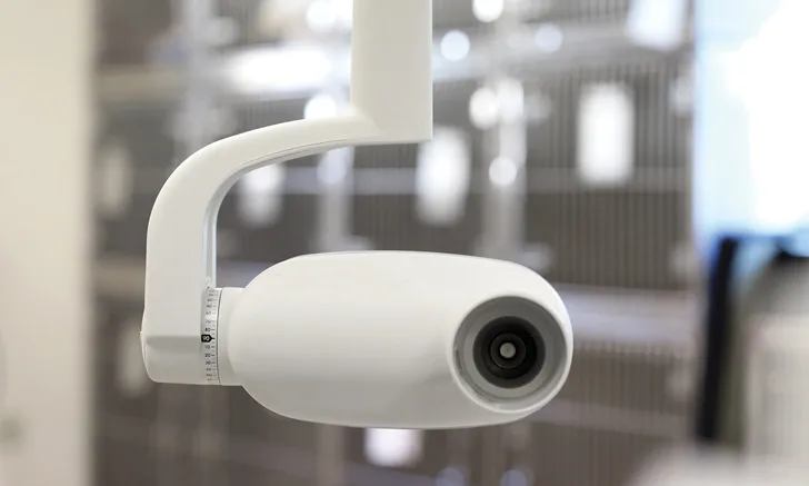 The dental radiography unit can be mounted to the wall or on a mobile stand. A wall-mounted unit is dedicated to a particular dental treatment area, but the varying lengths of the flexible arm can extend to the patient work area and collapse against the wall to save space. The mobile unit is on a wheeled stand that can be moved to different treatment areas and stored where convenient in the practice.1