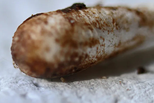 A cotton-tipped applicator containing otic debris consistent with ear-mite infestation. A mite can be seen hanging from the swab.