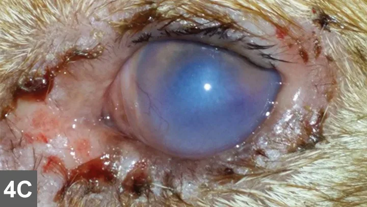 Look for surface irregularities, which may be caused by ulceration, perforation and iris prolapse, granulation tissue, feline corneal sequestration, keratoconus, or foreign bodies. Evaluate the corneal diameter. An enlarged diameter may indicate glaucoma, while a reduced diameter will indicate a phthisical or microphthalmic eye. In unilateral cases, one can easily compare the corneal diameter of the presenting eye to that of the normal eye. If uncertain, or in bilateral cases, the corneal diameter should be measured using the markings on a Schirmer tear test strip. The corneal diameter is breed-dependent, but is 18–22 mm in most dogs, and 16–18 mm in most cats. Alternatively, use an ultrasound machine to measure the axial length of the globe, which should be about 21 mm in most dogs and cats.